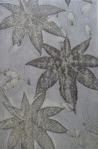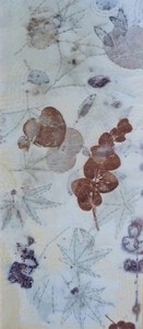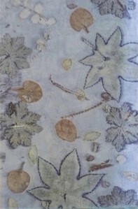 Een wand decoratie van ecoprint met handborduurwerk op katoen en linnen