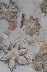 2022Wandpaneel van Ecoprint op katoen met handborduurwerk. De ondergrond is offwhite, de prints zijn grijs van de japanse esdoorn en organje van de eucalyptus. De stof is om een houten frame gespannen.