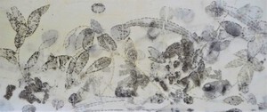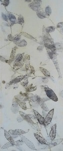 2022Ecoprint op katoen, 40x120 cm, in grijs/ blauwe tinten. De stof is om een houten frame gespannen.