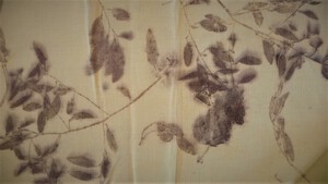 2022Middel zware linnen of linnen mix. de achtergrond van deze coupon is zacht geel, de afdrukken zijn paars/grijs. ecoprint met eucalyptus blad.